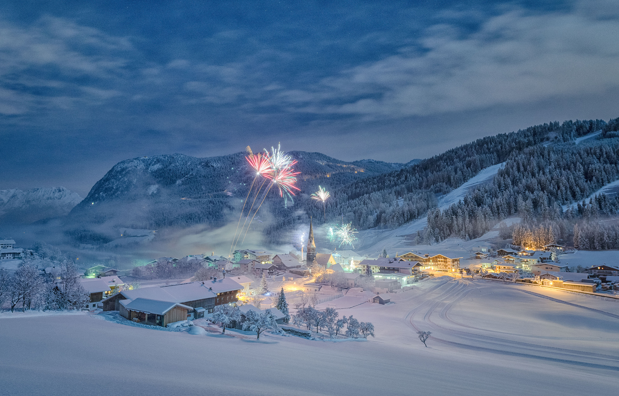 El que em crida la atenció d'aquest paisatge són els colors, Sobretot, els diferents tons de blaus o plancs amb el contrast dels focs artificials i la llum que ilumina el poble, Per mi és una imatge molt ben feta i bonica.